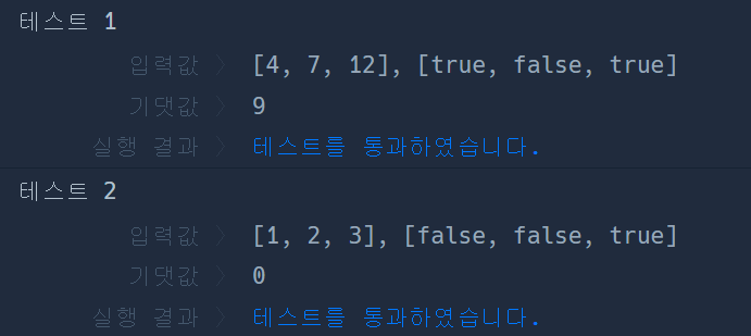 어떤 정수들이 있습니다. 이 정수들의 절댓값을 차례대로 담은 정수 배열 absolutes와 이 정수들의 부호를 차례대로 담은 불리언 배열 signs가 매개변수로 주어집니다. 실제 정수들의 합을 구하여 return 하도록 solution 함수를 완성해주세요.