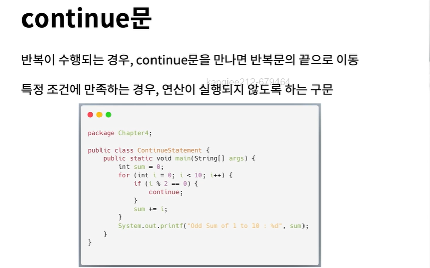 반복이 수행되는 경우, continue문을 만나면 반복문의 끝으로 이동