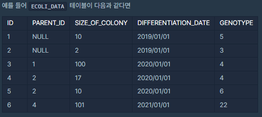 SELECT A.ID, COUNT(B.ID) AS CHILD_COUNT FROM ECOLI_DATA A LEFT JOIN ECOLI_DATA B ON A.ID = B.PARENT_ID GROUP BY A.ID HAVING (CHILD_COUNT IS NULL) = 0해당 문제에서 포인트는 JOIN 이다.