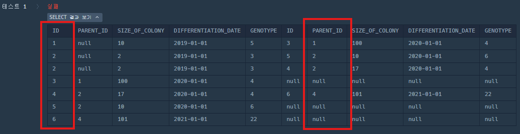 목적에 맞는 결과 값을 얻기 위해서는, ID 와 PARENT_ID 칼럼을 활용해야 한다.