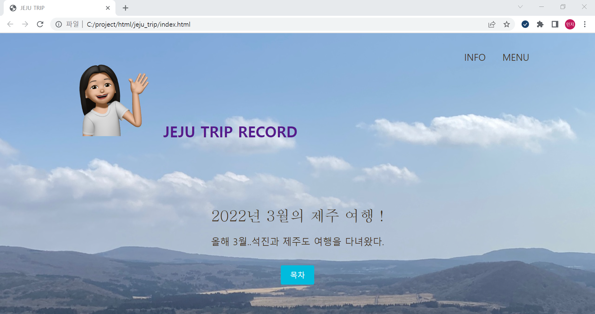 <head> <meta charset="utf-8"> <title>JEJU TRIP - INFO</title> <meta name="description" content="3월에 다녀온 제주 여행"> <!--css--> <link rel="stylesheet" href="https://unpkg.com/ress/dist/ress.min.css"> <link href="https://fonts.googleapis.com/css2?family=Jua&display=swap" rel="stylesheet"> <link href="css/style.css" rel="stylesheet"> </head>