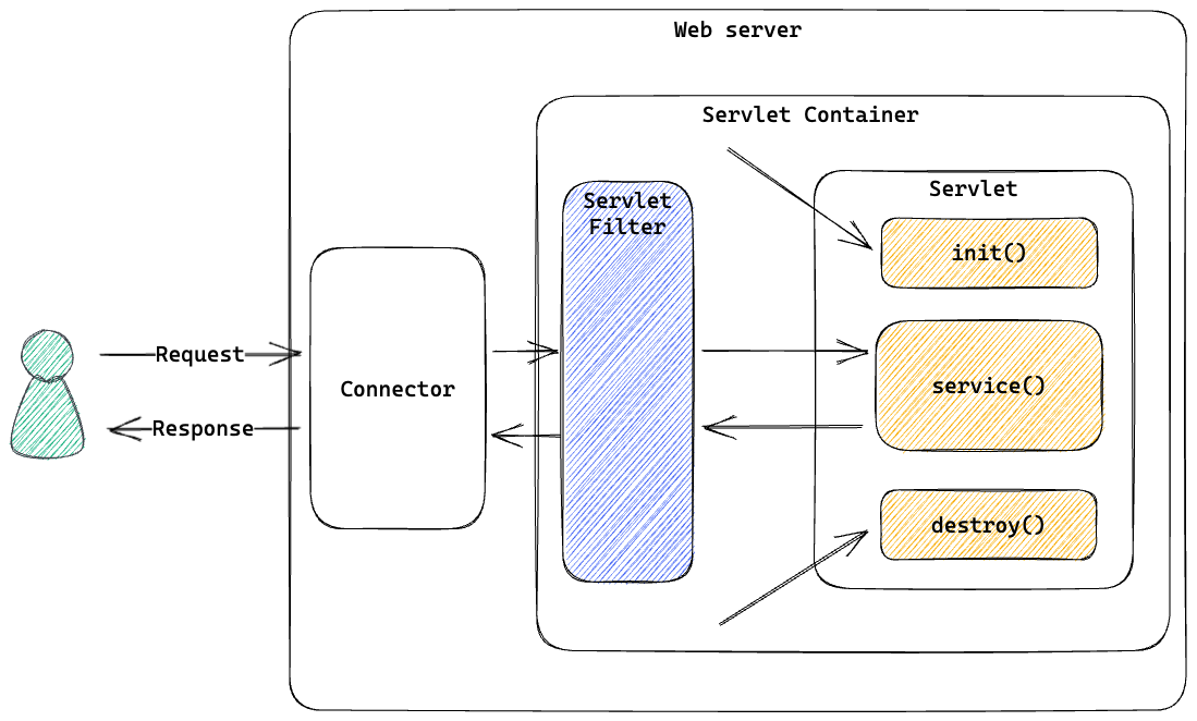 : Servlet을 초기화할 때 사용. Servlet 객체를 생성할 때 사용되며 이후 ServletContainer