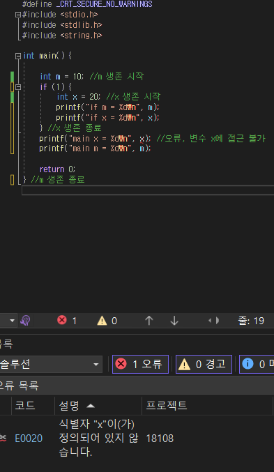 지역 변수는 자신이 선언된 코드 블록{} 안에서만 생존하고, 자신이 선언된 코드 블록을 벗어나면 제거된다. 따라서 이후에는 접근할 수 없다.