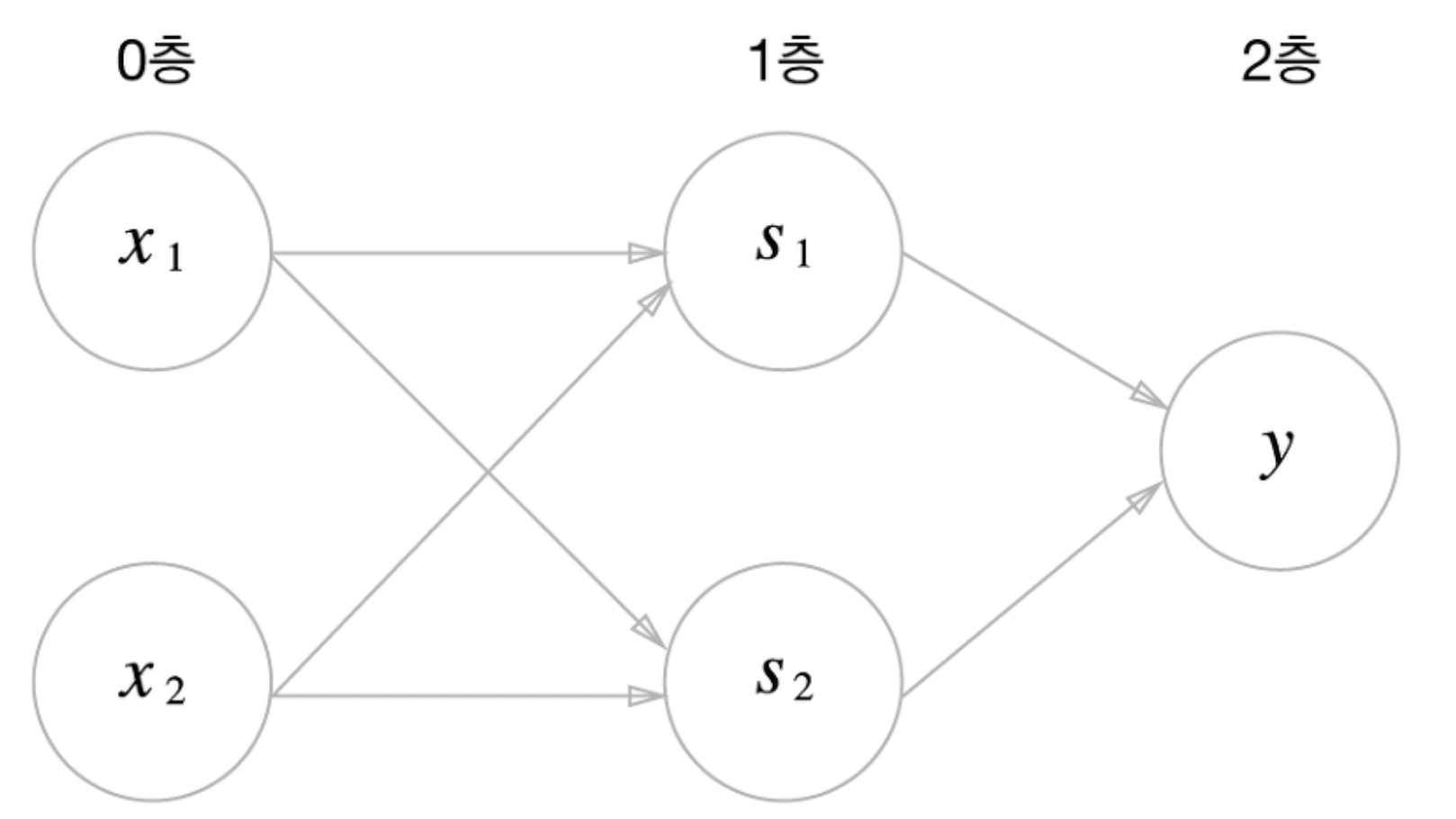 0층의 두 뉴런이 입력 신호를 받아 1층의 뉴런으로 신호를 보냄1층의 뉴런이 2층의 뉴런으로 신호를 보내고, 2층의 뉴런을은 y를 출력2층 구조를 사용해 퍼셉트론으로 XOR 게이트를 구현 가능