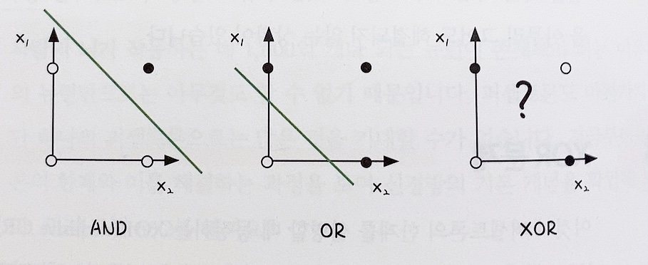 AND와 OR 게이트를 살펴보면 아래 그림과 같이 직선으로 영역을 나눌 수 없다.