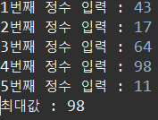 1 ~ 100 까지의 정수 중에 키보드로 5개의 정수를 입력을 받아서 5개의 정수 중에서 최대값을 화면에 보여주세요