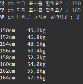 표시할 신장의 범위(시작값 / 종료값 / 증가값)는 정수로 할 예정이며, 키보드로 입력을 받을 예정
