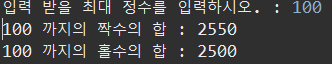 for문을 이용해서 키보드로 입력받은 수 까지의 홀수의 합과 짝수의 합을 구하여 화면에 보여주자
