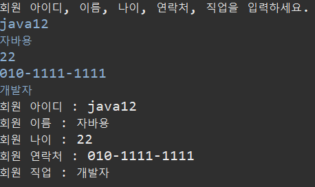 System.out.println("회원 아이디, 이름, 나이, 연락처, 직업을 입력하세요.");