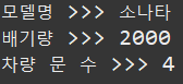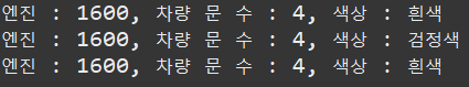 System.out.println("엔진 : " + cc + ", 차량 문 수 : " + door + ", 색상 : " + color);