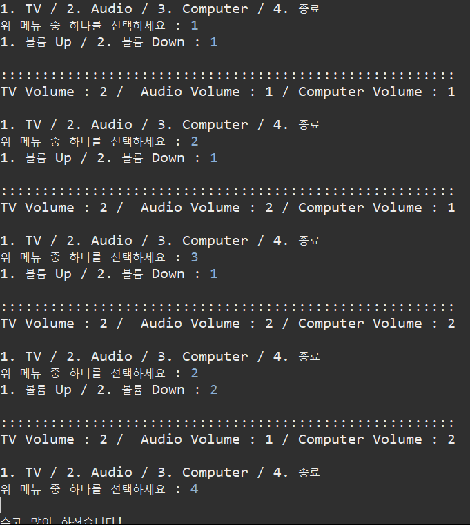 System.out.println("1. TV / 2. Audio / 3. Computer / 4. 종료");