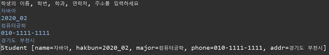 System.out.println("학생의 이름, 학번, 학과, 연락처, 주소를 입력하세요");