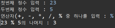 System.out.print("연산자(+, -, *, /, % 중 하나를 입력 : ");