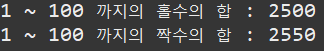 System.out.println("1 ~ 100 까지의 홀수의 합 : " + oddSum);