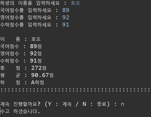System.out.print("계속 진행할까요? (Y : 계속 / N : 종료) : ");