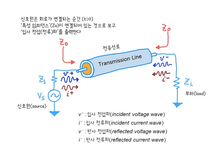 전송선로에 입력되는 ‘입사파’(v+, i+) 와 ‘부하’단에서 반사되어 입력되는 ‘반사파’ (v-, i-)