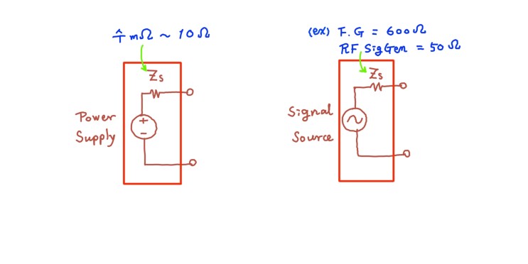 ‘부하’는 전력을 소모하니 ‘임피던스’를 가진다는 것이 이상하지 않겠지만, ‘소스 임피던스’란 말이 낯선 사람들이 있을 것이다. 그렇다. 신호원(signal source)도 ‘임피던스’를 가진다. 그래서 ‘펑션 제네레이터’(Function Generator)나 ‘RF 신호 발생기’(RF Signal Generator)같은 장비들도 출력단자에 반드시 ‘소스 임피던스’가 되는 ‘출력 임피던스’가 표기 되어있다 (예를 들면, 펑션 제네레이터는 600 옴, RF장비들은 50 옴 처럼, 표기가 안되어 있으면 반드시 데이터 쉬트를 살펴본다) 그리고 이들 장비를 이용해 회로를 시험할 때도 반드시 회로의 입력 임피던스와 매칭 상태를 고려해 시험을 하는 것이 기본이다. 그렇지 않으면 장비에서 표시되는 신호의 크기와 실제 회로에 입력되는 신호의 크기 사이에 차이가 발생하게 되고 회로를 잘못 해석하게 된다.