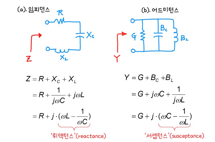 마지막으로, ‘임피던스’의 역수를 ‘어드미턴스’ 라 정의하고, 다시 이 ‘어드미턴스’ 역시 순수하게 전력을 소모하는 ‘컨덕턴스’ (G) 성분과 에너지를 저장하는 ‘서셉턴스’(B) 성분으로 구성되고, 이렇듯 ‘임피던스’와 ‘어드미턴스’를 구분하는 이유는 회로해석을 쉽게 하기 위한 것이다.