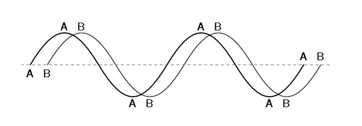 위 그림에서 x축의 왼쪽을 진행방향으로 보면 신호 B에 대해 어떤 이유로던 ‘시간지연’이 생겨 ‘신호A가 신호B보다 앞서있다(영어로는 A가 B를 lead하고 있다)’ 라고 하거나, 아니면 ‘신호 B는 신호 A보다 뒤져있다(영어로는 B가 A에 lag하고 있다)’라고 표현한다.
