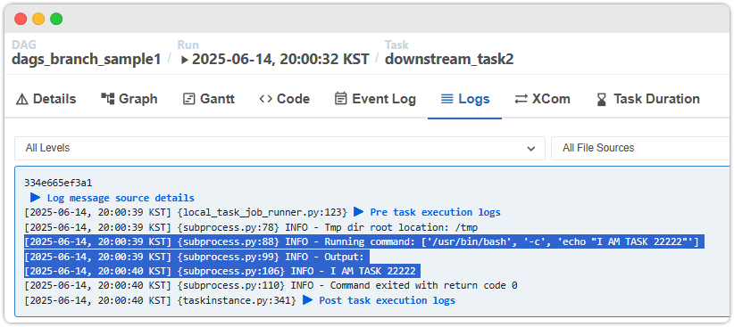 실행한 후 그래프를 보면 downstream_task1 은 skipped 되서 실행이 안됐고,