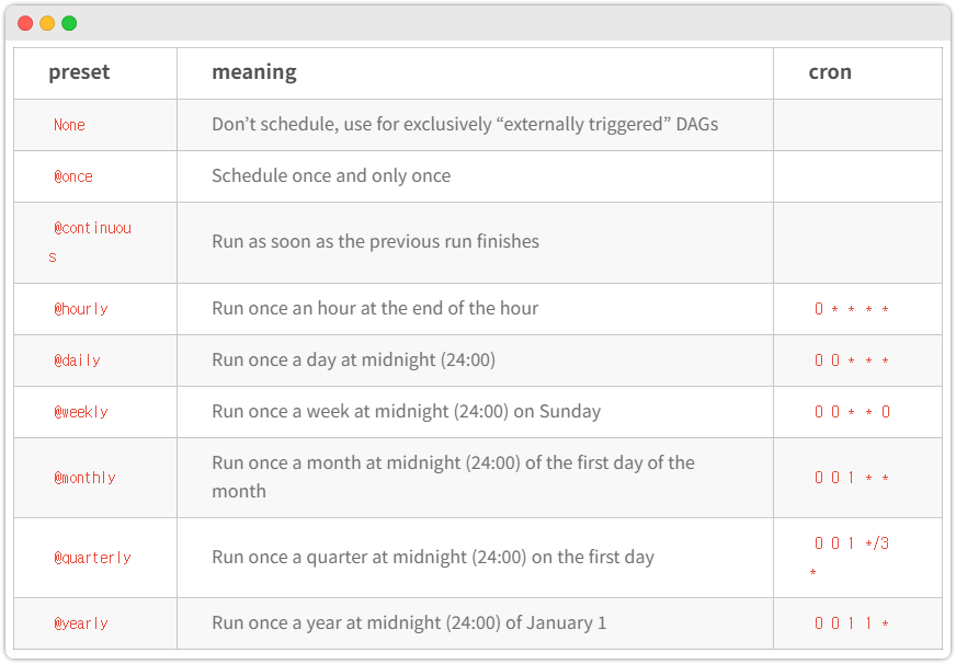 schedule="@daily" 처럼 인자값을 줘서 사용합니다.cron 표현식은 이정도만 알아두죠! 다음으로 넘어 갑시다.