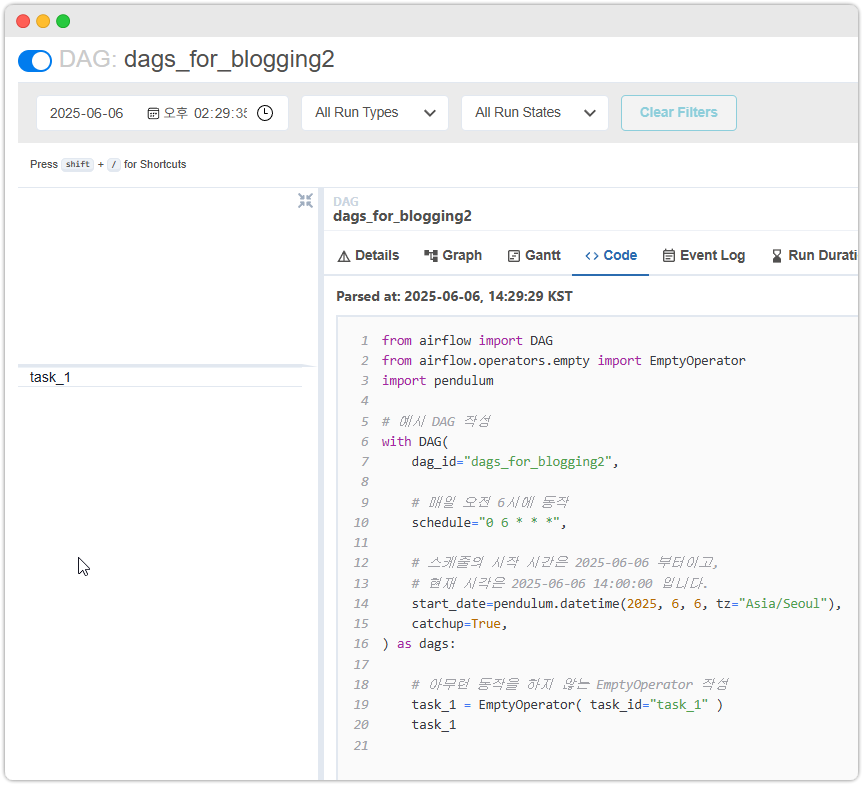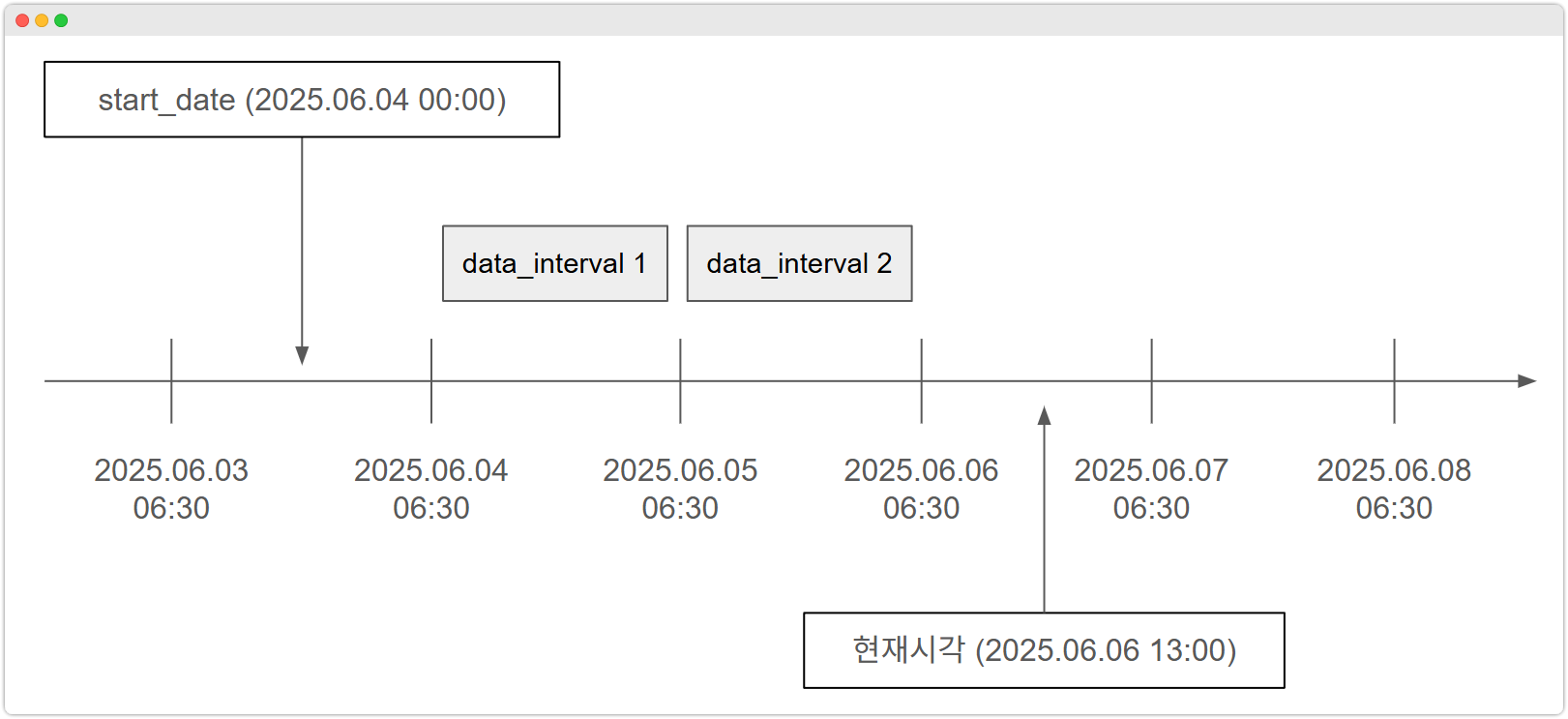 data interval이 2개만 만들어지는 이유는start_date=2025.06.04로 설정해서 그런겁니다.