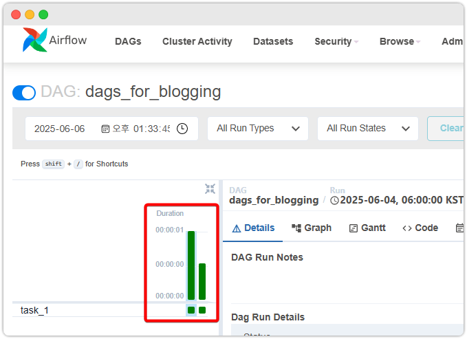 이번에는 각각의 DAG run 의 Detail 정보를 조회해보겠습니다.