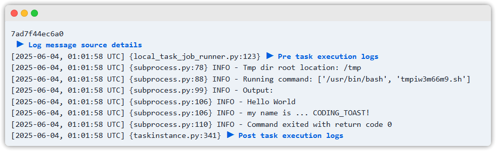 실행시키고 Task 의 Log 를 확인해볼까요?