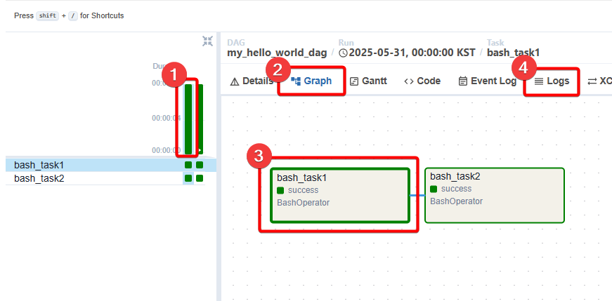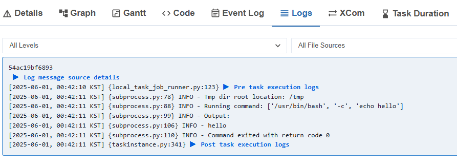 로그를 통해서 BashOperator 가 정상적으로 명령어를 수행한 것을 확인할 수 있습니다.