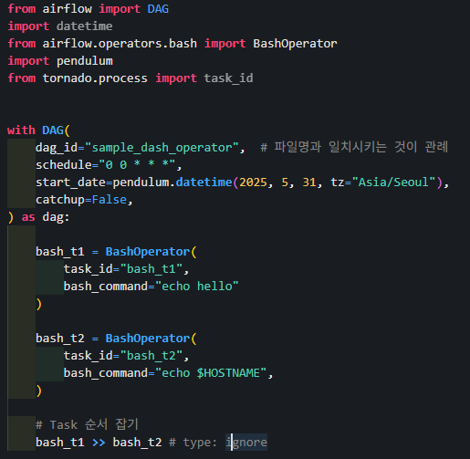 다만 이때는 저희는 Task 가 아닌 Operator 라는 것을 사용해서 DAG 를 구성합니다.