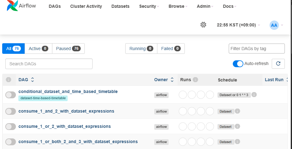 이후에 airflow ui 를 엽니다. Auto-refresh 를 활성화하고