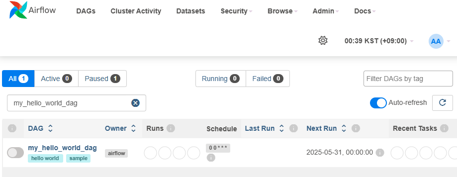 한 1~2분 정도 지나면 저희가 만든 DAG, my_hello_world_dag 화면에 보이기 시작합니다.