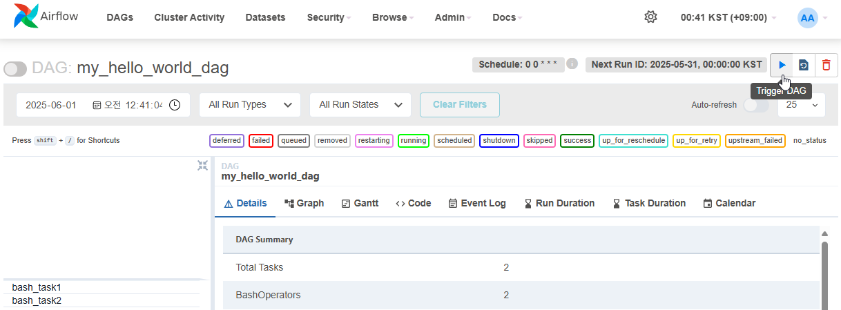 화면 우측에 있는 Trigger DAG 버튼을 클릭해서 강제로 시작합니다.