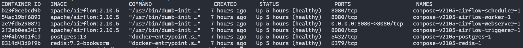 airflow-schedulerairflow-workerairflow-webserverairflow-triggerpostgresredis 이렇게 6개가 보인다면 일단 갯수는 맞는 겁니다.