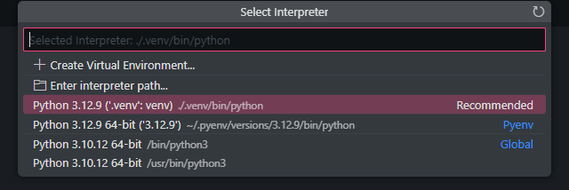 위 그림처럼 .venv/bin/python 이라는 경로가 보이는 인터프리터를 선택해주세요.
