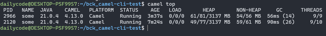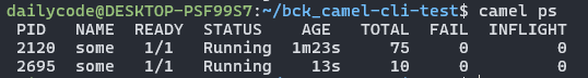 camel ps # 로그를 보려는 camel 프로세스의 PID (또는 NAME) 확인