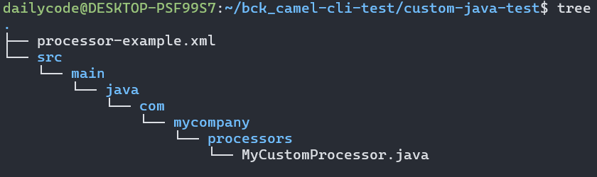xml dsl 파일이 최상위 디렉토리(camel run 이 실행될 위치)에 있고,src/main/java 디렉토리가 최상위 디렉토리 하부에 위치하며,com/mycompany/processors 디렉토리를 다시 src/main/java 하부에 생성.com/mycompany/processors 디렉토리명은 추후 패키지 경로로 사용됩니다.<?xml version="1.0" encoding="UTF-8"?>