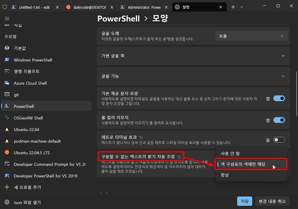 시작 > 기본 프로필 에서 앞서 설치한 PowerShell 을 지정합니다.