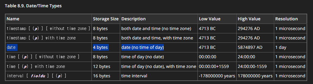 date 타입을 주의해야 합니다. postgresql 에 익숙하신 분들은 date 타입이라고 하면