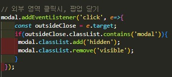 추가적 기능으로 modal팝업 외부화면 클릭 시, 닫기 기능도 넣어줬다.