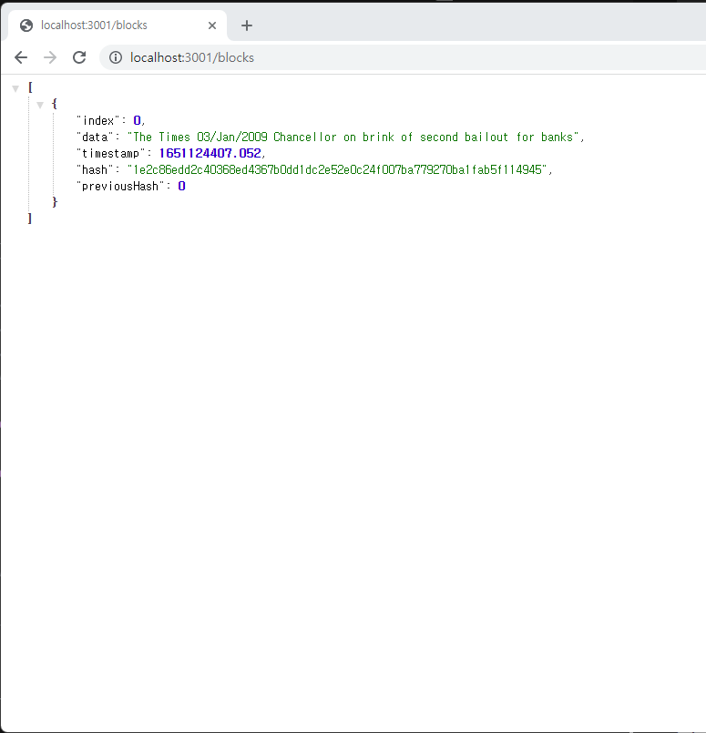previousHash : 이전 블록의 해쉬(이전 블록을 참조한다)