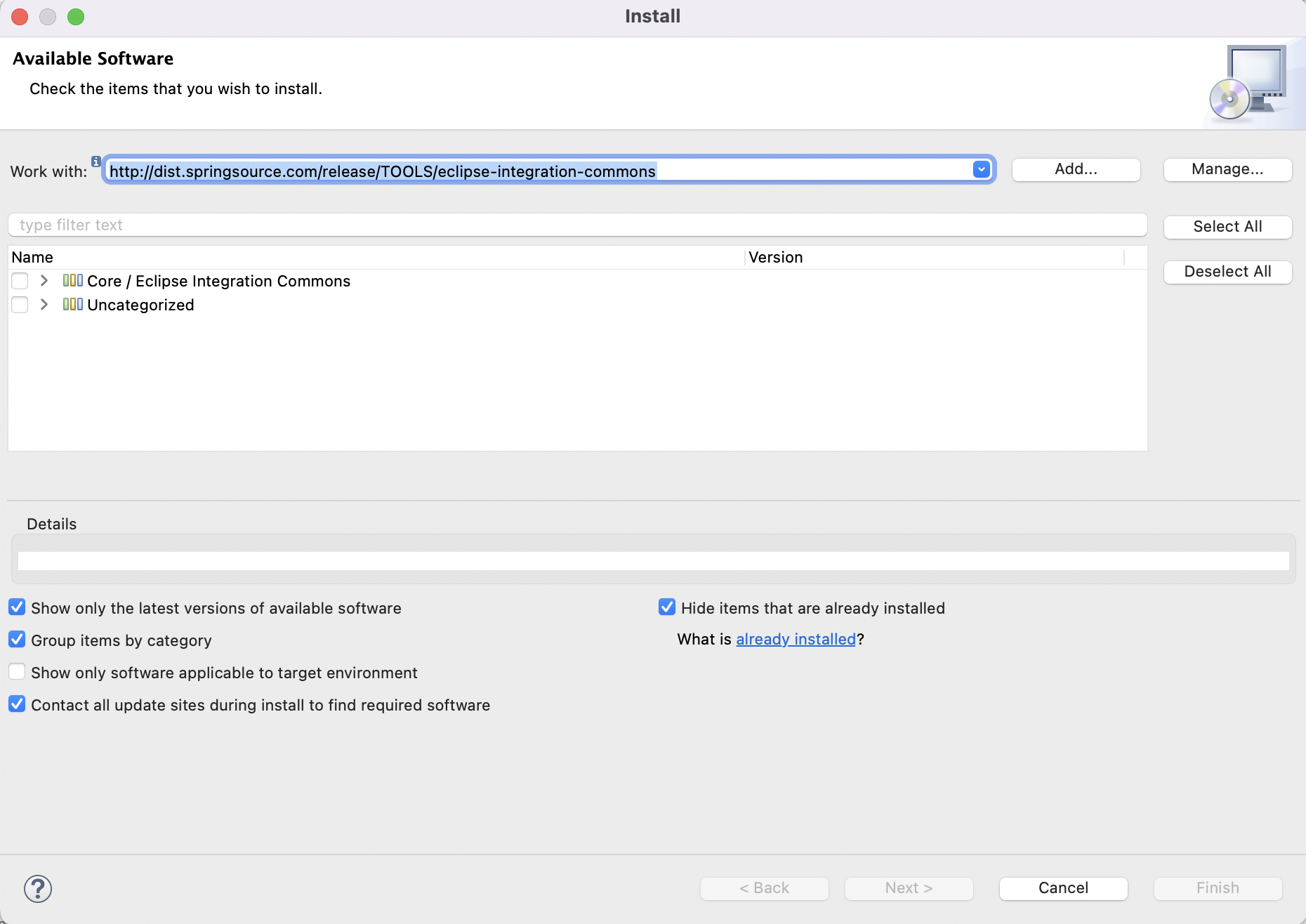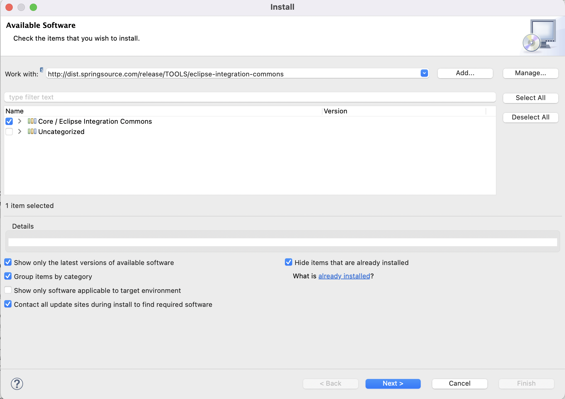 Core/Eclipse Intergration Commons를 선택하고 Next를 눌러서 설치하자.