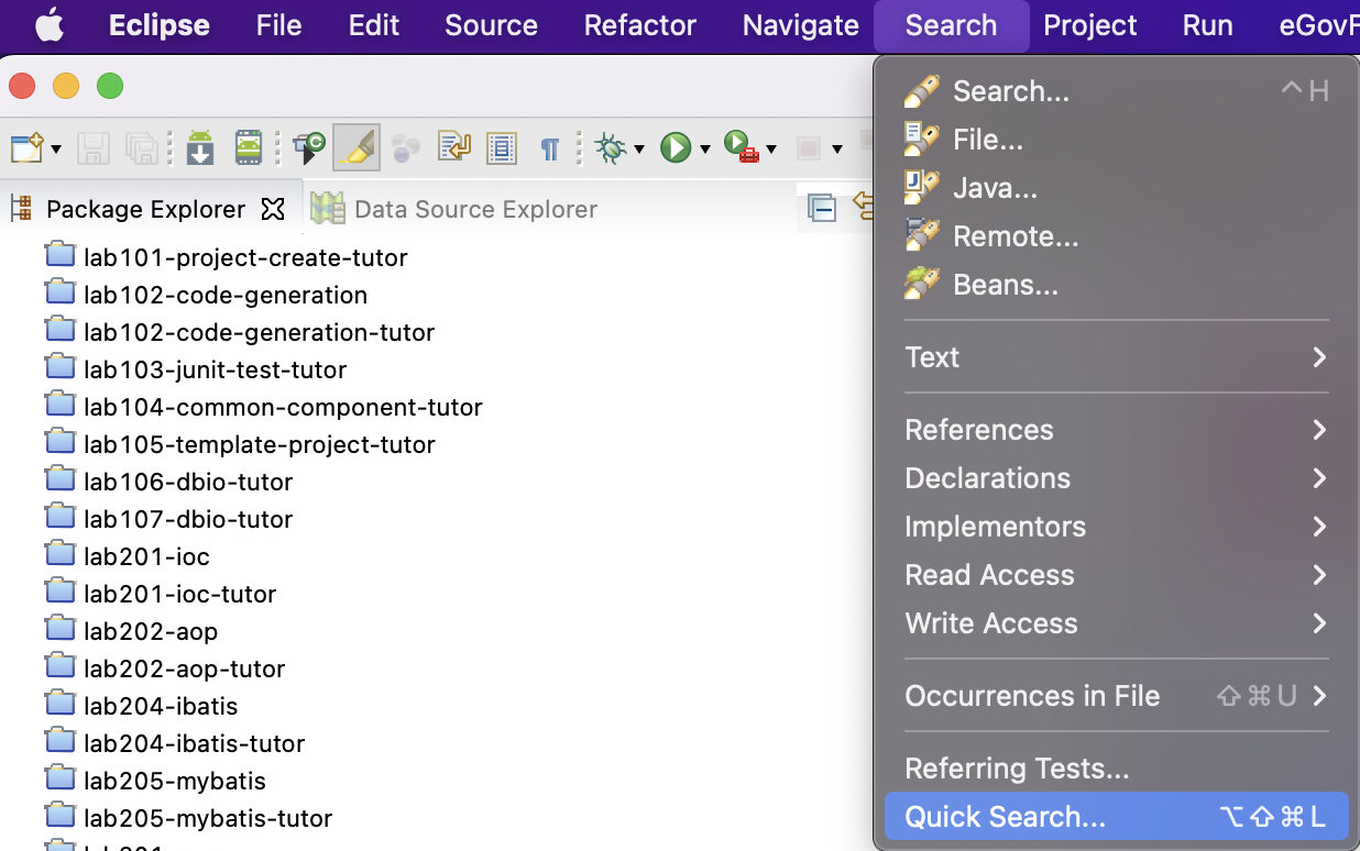 설치가 끝나면 이클립스를 다시 시작하자. Search - Quick Search메뉴가 보일것이다.