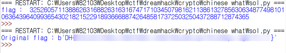 lag 값이 처음에 bytes_to_long 된 값이기 때문에 반대로 long_to_bytes 해주면 원래 형태의 flag를 얻을 수 있다.