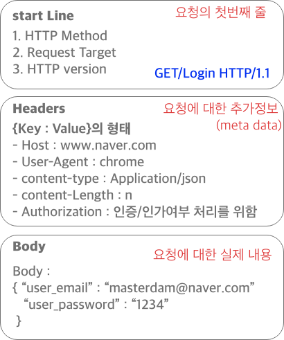 λ νλ‘ νΈμλμμ λ°±μλλ‘ μΌ(λ°μ΄ν°μ²λ¦¬)λ₯Ό μμνκΈ° μν΄ λ³΄λ΄λ "λ©μμ§"μ΄λ€. κ·Έλ¬λ κ·μΉμ λ§κ² 보λ΄μΌ νλ―λ‘ νλ¨κ³Ό κ°μ ꡬ쑰μ λ΄μ©μ ν¬ν¨νμ¬ λ³΄λ΄μΌ νλ€. νλ¨κ³Ό κ°μ΄ ꡬμ±λμ΄ μλ λ©μμ§μ΄λ€.
