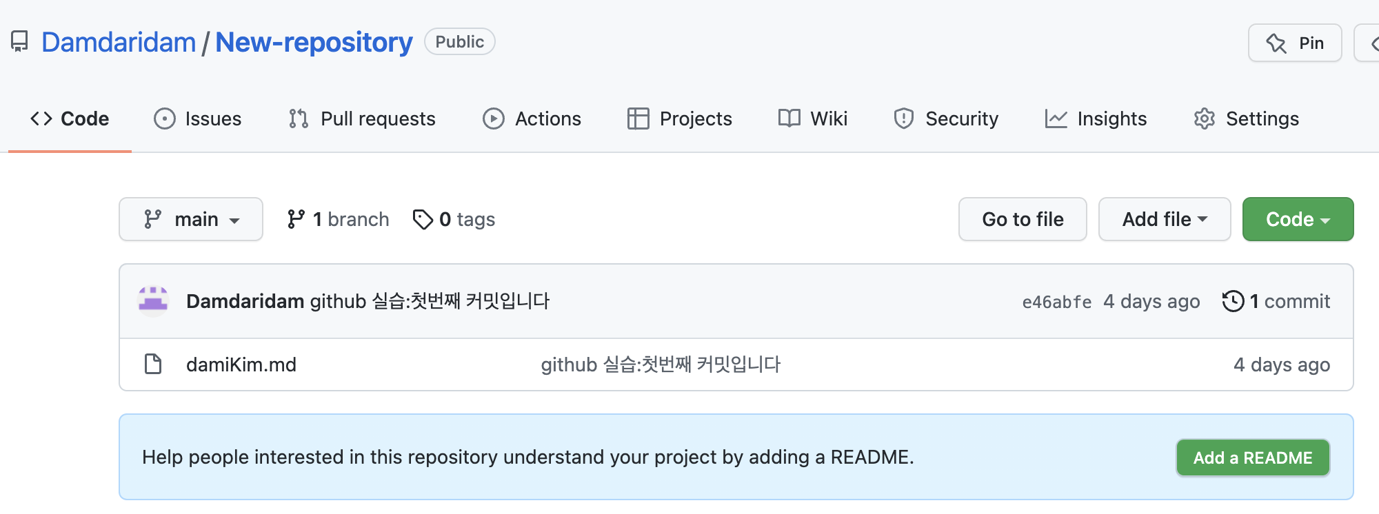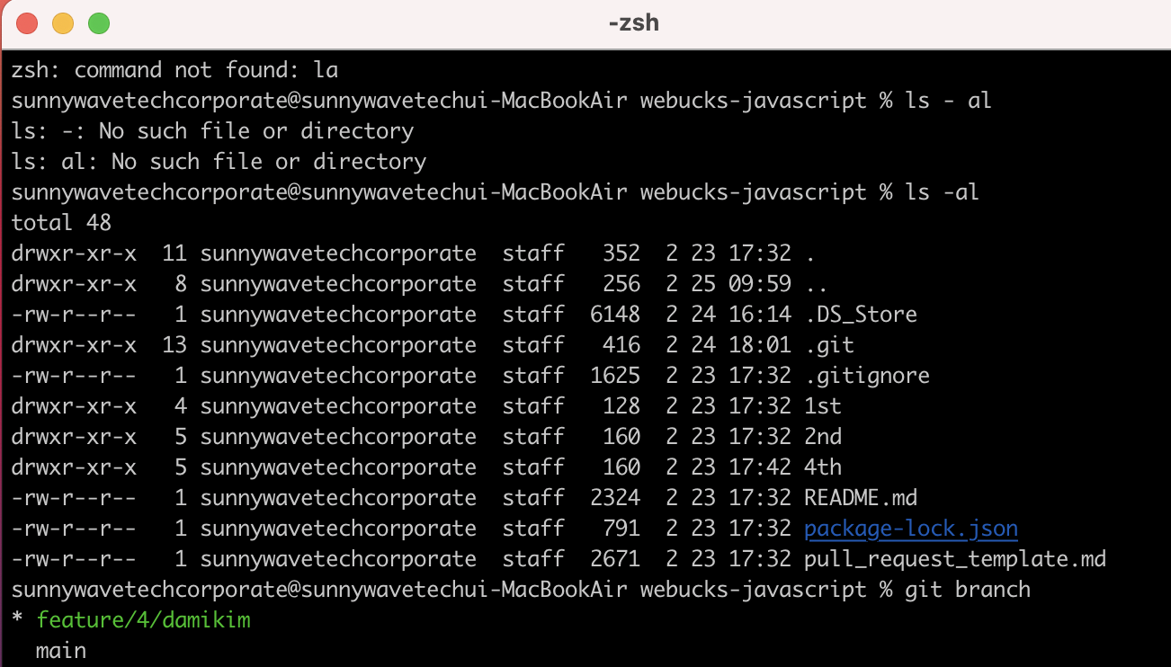 👀 나의 브렌치 터미널로 확인해보기나의 로컬에는 main(master)와 feature/4/damikim 이라는 브랜치가 있음!