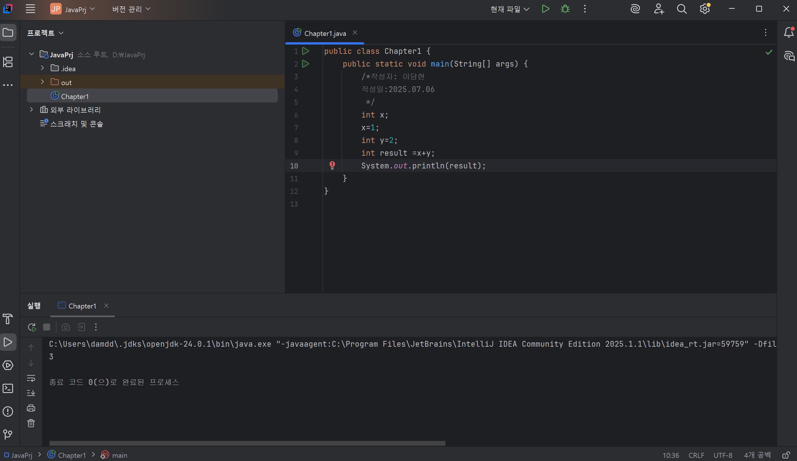 IDE는 미리 설치한 IntelliJ로 개발 환경 구축 새 프로젝트 생성 그리고 주석 사용과 실행문 연습;