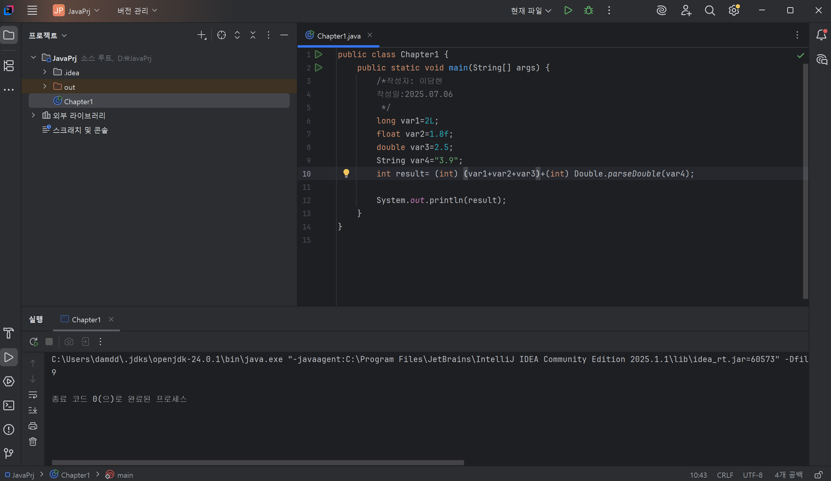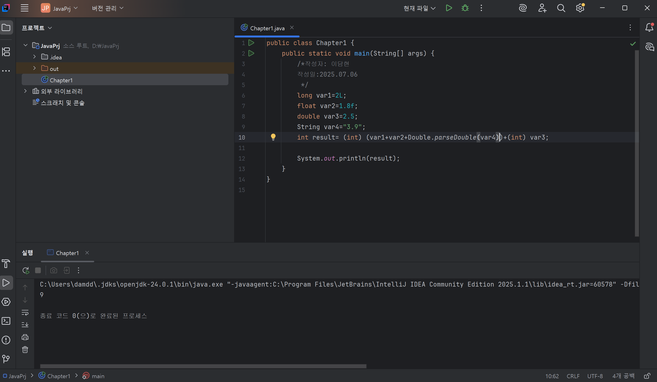 방법2는 방법1과 같은 맥락으로 var3의 2.5의 값을 int형으로 형변환하여 2로 만들고 +연산을 하면 9.7이고 int형으로 형 변환을 하면 result에 9가 반환 된다.