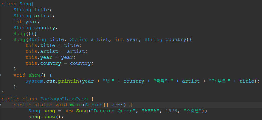 - main() 메소드에서는 1978년, 스웨덴 국적의 ABBA가 부른 "Dancing Queen"을