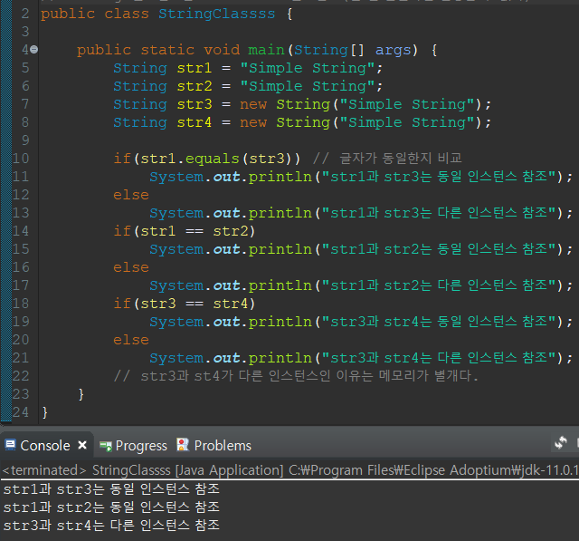 System.out.println("str3과 str4는 다른 인스턴스 참조");